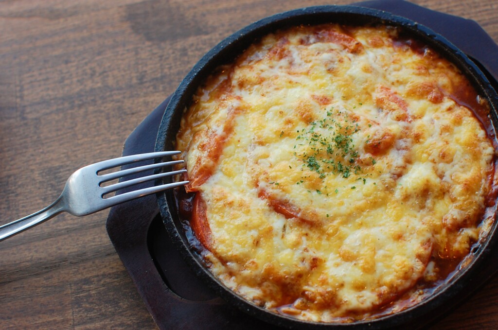 写真はナスとトマトのチーズ焼き。